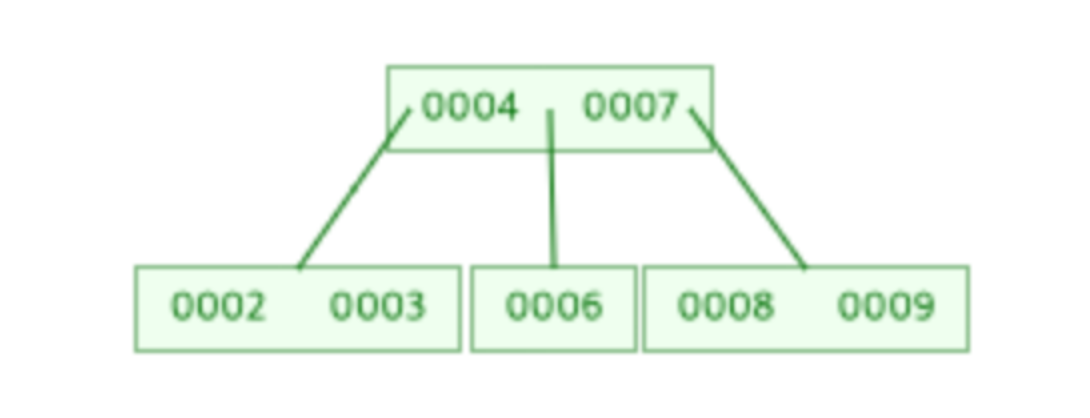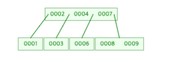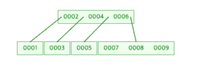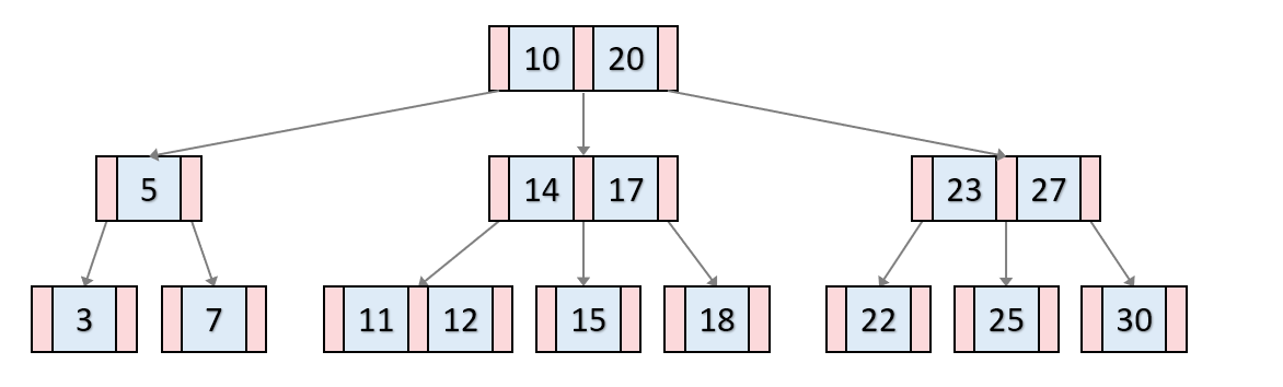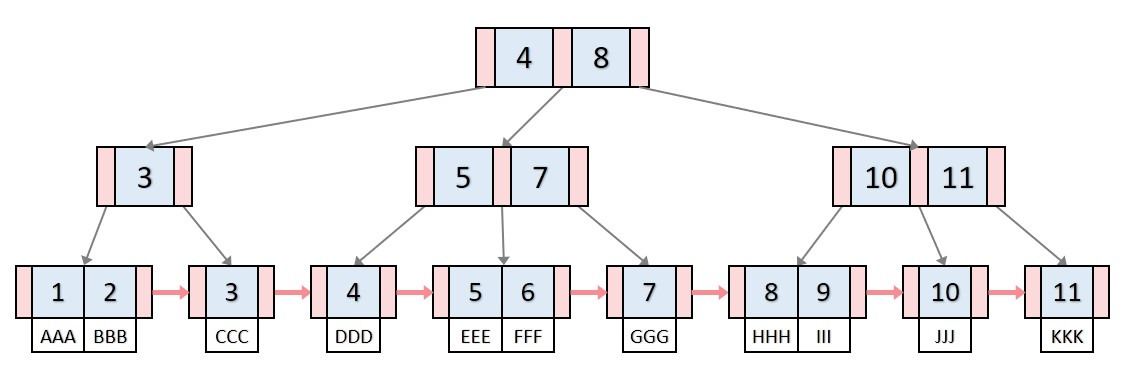 - 내부 노드: 인덱스 키만을 포함하고, 자식 노드에 대한 포인터를 가진다. 데이터는 저장하지 않는다.